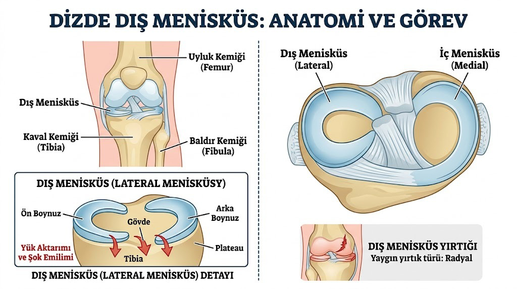 Dış Menisküs Nedir? Dış menisküs (lateral menisküs), diz eklemi içinde uyluk kemiği (femur) ile kaval kemiği (tibia) arasında yer alan yarım ay şeklinde kıkırdak yapıdır. Dizde iki menisküs bulunur: iç (medial) ve dış (lateral) menisküs. Dış menisküs daha hareketli bir yapıya sahiptir ve dizin dış kısmında konumlanır. Bu yapı, eklem yüzeylerinin birbiriyle uyumlu çalışmasını sağlayarak […]
