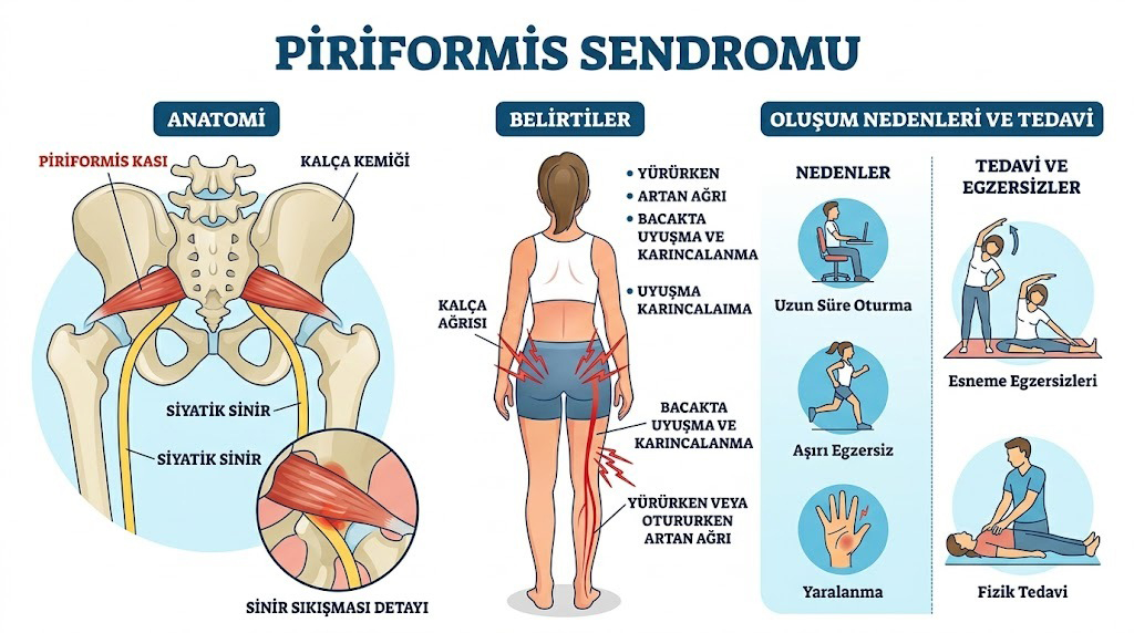 Piriformis Sendromu Nedir? Piriformis sendromu, kalça bölgesinde yer alan piriformis kasının, hemen altından geçen siyatik sinire baskı yapması sonucu ortaya çıkan ağrılı bir klinik tablodur. Piriformis kası, kalçanın derin kas gruplarından biri olup kalça stabilitesinde ve dış rotasyon hareketinde önemli rol oynar. Bu kasın spazma girmesi, kalınlaşması veya inflamasyona uğraması durumunda siyatik sinir sıkışabilir ve […]