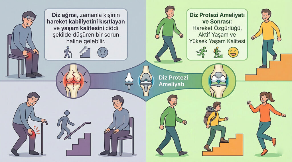 Diz ağrısı, zamanla kişinin hareket kabiliyetini kısıtlayan ve yaşam kalitesini ciddi şekilde düşüren bir sorun haline gelebilir. Özellikle ileri evre diz kireçlenmesi olan hastalar için diz protezi ameliyatı etkili bir çözüm sunar. Ancak hastaların aklındaki ilk soru genellikle aynıdır: Diz protezi ameliyatı zor mu? Bu soru son derece doğaldır. Ameliyat kelimesi pek çok kişide endişe […]