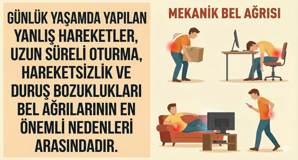 Mekanik bel ağrısı, bel bölgesindeki kaslar, bağlar, eklemler, omurlar ve diskler gibi yapısal unsurların zorlanmasına bağlı olarak ortaya çıkan, en sık görülen bel ağrısı türüdür. Günlük yaşam aktiviteleriyle doğrudan ilişkili olması, bu ağrı tipinin en belirgin özelliğidir. Uzun süre masa başında çalışmak, yanlış duruş, ani ve kontrolsüz hareketler, ağır kaldırma, hareketsiz yaşam tarzı ya da […]