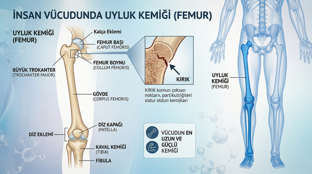 Uyluk Kemiği (Femur) Nedir ve Nerede Bulunur? Uyluk kemiği, tıbbi adıyla femur, insan vücudunun en uzun ve en güçlü uzun kemiğidir. Proksimalde kalça eklemini oluşturan femur başı ile asetabuluma eklem yaparken, distal uçta diz ekleminin önemli bir bileşeni olarak tibia ve patella ile artikülasyon kurar. Bu anatomik yerleşim, femuru hem yük taşıma hem de hareket […]