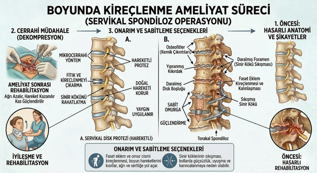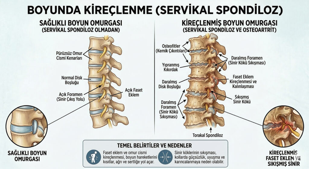 Boyun Kireçlenmesi: Nedenleri, Belirtileri ve Tedavi Yöntemleri Boyun bölgesi, omurganın en hareketli ve aynı zamanda en hassas bölümlerinden biridir. Günlük yaşamda başın hareketlerini sağlayan bu yapı; omurlar, diskler, bağ dokuları ve kaslardan oluşur. Zamanla bu yapılarda meydana gelen yıpranmalar, halk arasında boyun kireçlenmesi olarak bilinen dejeneratif bir sürece yol açabilir. Tıp literatüründe servikal osteoartrit veya […]