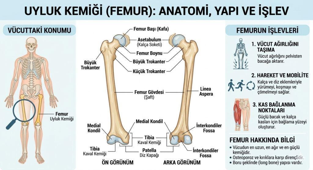 Uyluk Kemiği (Femur) Hakkında Bilmeniz Gerekenler İnsan vücudunda hareket kabiliyeti ve yük taşıma kapasitesi açısından en önemli yapılardan biri uyluk kemiğidir. Tıp dilinde femur olarak adlandırılan bu kemik, yalnızca alt ekstremitenin en güçlü kemiği olmakla kalmaz; aynı zamanda vücudun ağırlığını taşıyan temel anatomik yapılardan biridir. Günlük yürüyüşten koşmaya, merdiven çıkmaktan oturup kalkmaya kadar pek çok […]