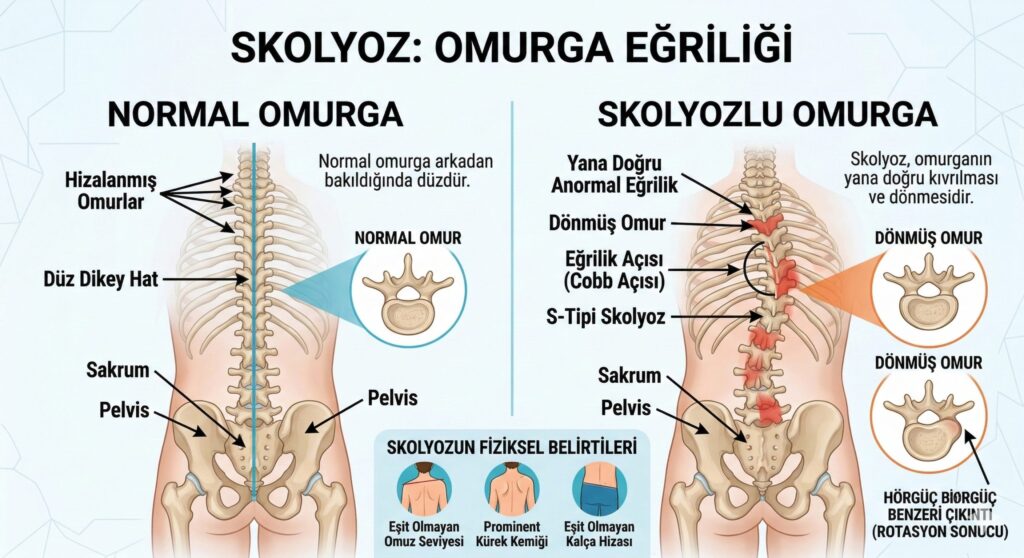 Skolyoz Nedir? Tıbbi literatürde sıkça karşımıza çıkan ancak halk arasında genellikle basit bir “duruş bozukluğu” sanılan skolyoz, aslında omurganın karmaşık ve üç boyutlu bir şekil bozukluğudur. Sağlıklı bir omurgaya arkadan bakıldığında enseden kuyruk sokumuna kadar düz bir hat şeklinde inmesi gerekirken, skolyoz durumunda omurga sağa veya sola doğru kıvrılarak “C” ya da “S” harfini andıran […]